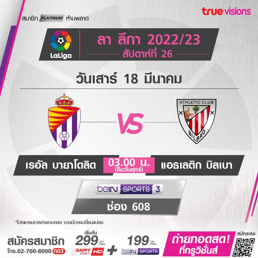 Valladolid vs Athletic เวลา 03.00-05.00 ทางช่อง beIN 3 (608)