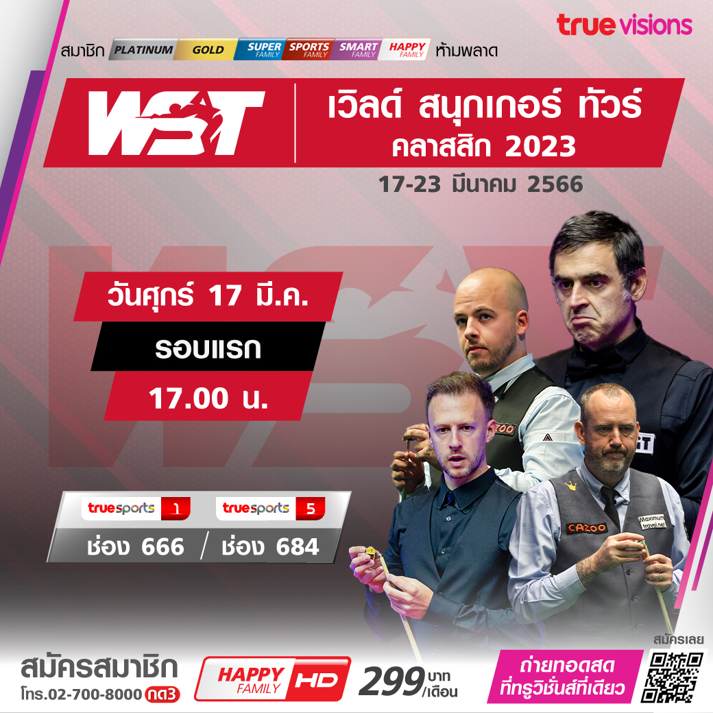 แฟนๆ กีฬาสนุกเกอร์ห้ามพลาด กับความเข้มข้น เร้าใจ ของการแข่งขันรายการเก็บคะแนนสะสมโลก โค้งสุดท้ายของฤดูกาล 2022/23 มือดังแห่ร่วมดวลคิว รายการ เวิลด์ สนุ้กเกอร์ ทัวร์ คลาสสิก สดครบจุใจ ร่วมลุ้นกันว่าใครจะสมหวังเป็นแชมป์คนใหม่ ชมสดจุใจ ทาง ทรูวิชั่นส์ ที่เดียว