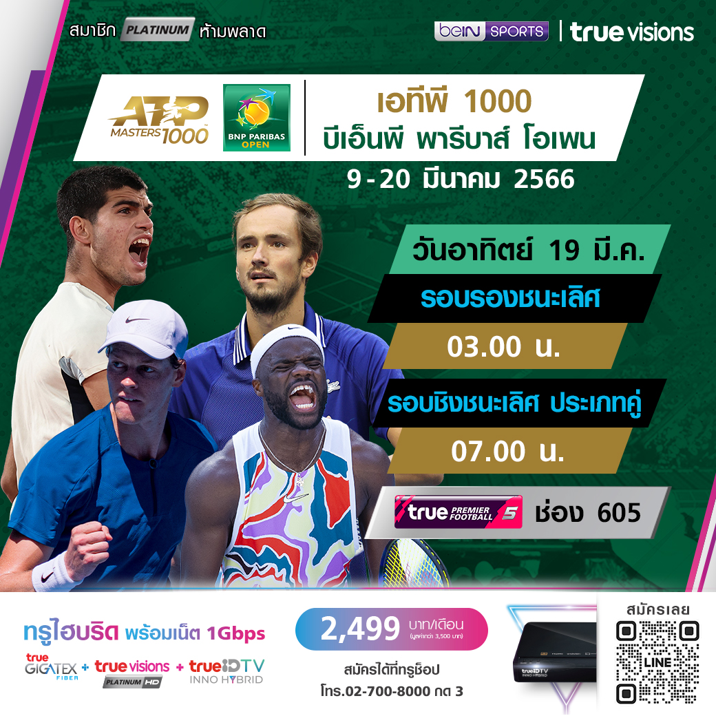 เทนนิส เอทีพี เวิลด์ ทัวร์ 1000 ซีรี่ส์ รายการ บีเอ็นพี พาริบาส์ โอเพ่น มาถึงในรอบรองชนะเลิศในประเภทเดี่ยว ลุ้นเชียร์นักเทนนิสระดับโลกใครจะผ่านเข้าไปชิงแชมป์ ชมสด ทาง ทรูวิชั่นส์ ที่เดียว