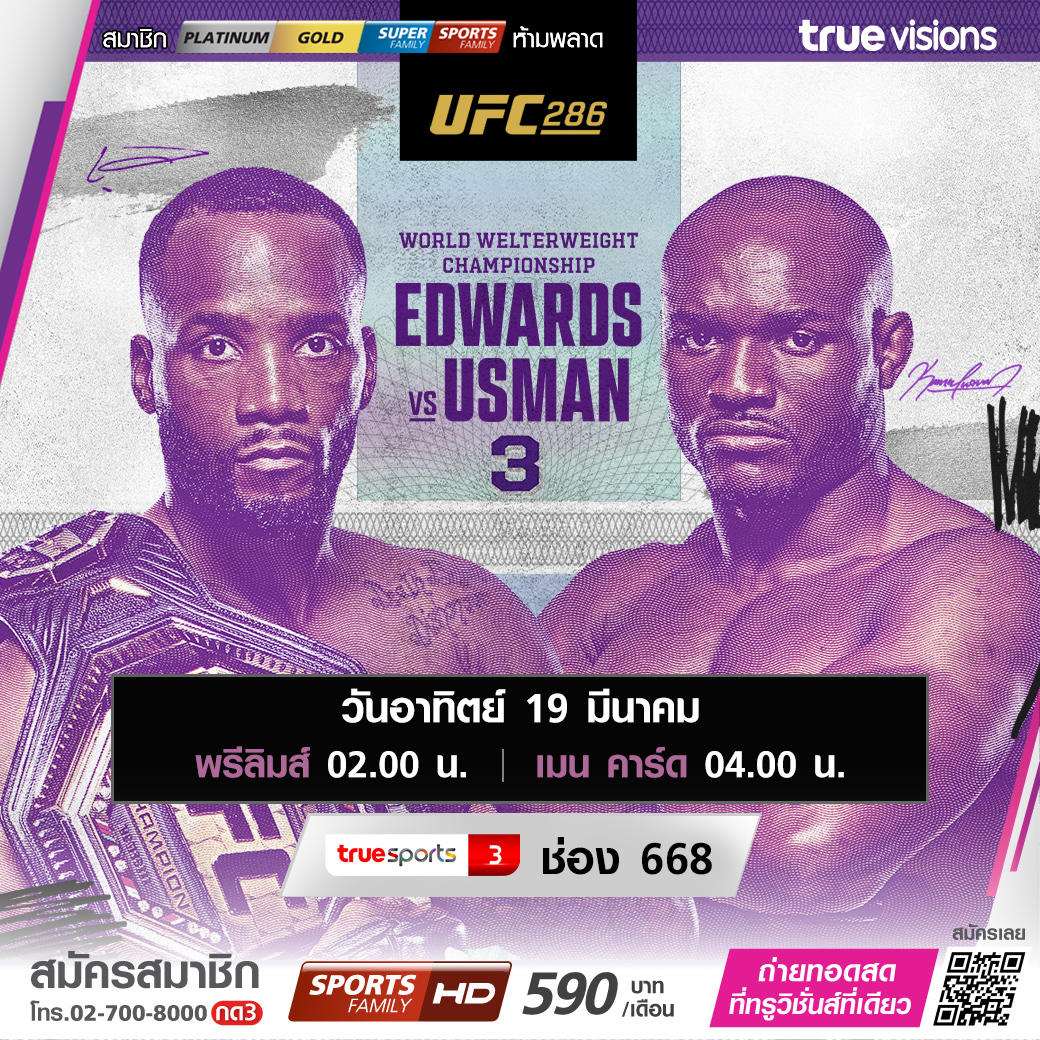 บัญชีแค้นที่ต้องสะสาง ตำแหน่งแชมป์ที่ต้องช่วงชิงมาครอบครองให้ได้ กับศึกใหญ่ ยูเอฟซี 286 นัดฟาดฟันกันที่กรุงลอนดอน ประเทศอังกฤษ แชมป์เวลเตอร์เวตหมาดๆ ลีออน เอ็ดเวิร์ดส์ เปิดโอกาสให้ คามารู อุสมาน ล้างตา โดยมีเข็มขัดแชมป์เวลเตอร์เวตเป็นเดิมพัน ชมสด มันส์ จุใจทั้งช่วง พรีลิมส์ และ เมน คาร์ด ชมสด ทาง ทรูวิชั่นส์ ที่เดียว