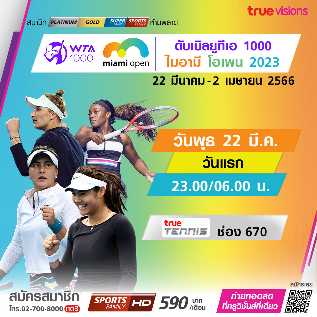 รายการใหญ่สัปดาห์ต่อสัปดาห์ มากันแบบไม่ต้องพัก กับเทนนิสหญิง ดับเบิ้ลยูทีเอ ทัวร์ 1000 ซีรีส์ ไมอามี่ โอเพ่น ชิงเงินรางวัลรวมกว่า 8.8 ล้านเหรียญสหรัฐฯ นักเทนนิสขวัญใจของแฟนๆ มาปะทะฝีมือกัน เพื่อก้าวสู่ตำแหน่งแชมป์ปีนี้ ชมสดครบทุกรอบ