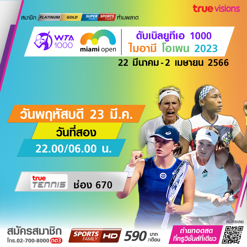 รายการใหญ่สัปดาห์ต่อสัปดาห์ มากันแบบไม่ต้องพัก กับเทนนิสหญิง ดับเบิ้ลยูทีเอ ทัวร์ 1000 ซีรีส์ ไมอามี่ โอเพ่น ชิงเงินรางวัลรวมกว่า 8.8 ล้านเหรียญสหรัฐฯ นักเทนนิสขวัญใจของแฟนๆ มาปะทะฝีมือกัน เพื่อก้าวสู่ตำแหน่งแชมป์ปีนี้ ชมสดครบทุกรอบ