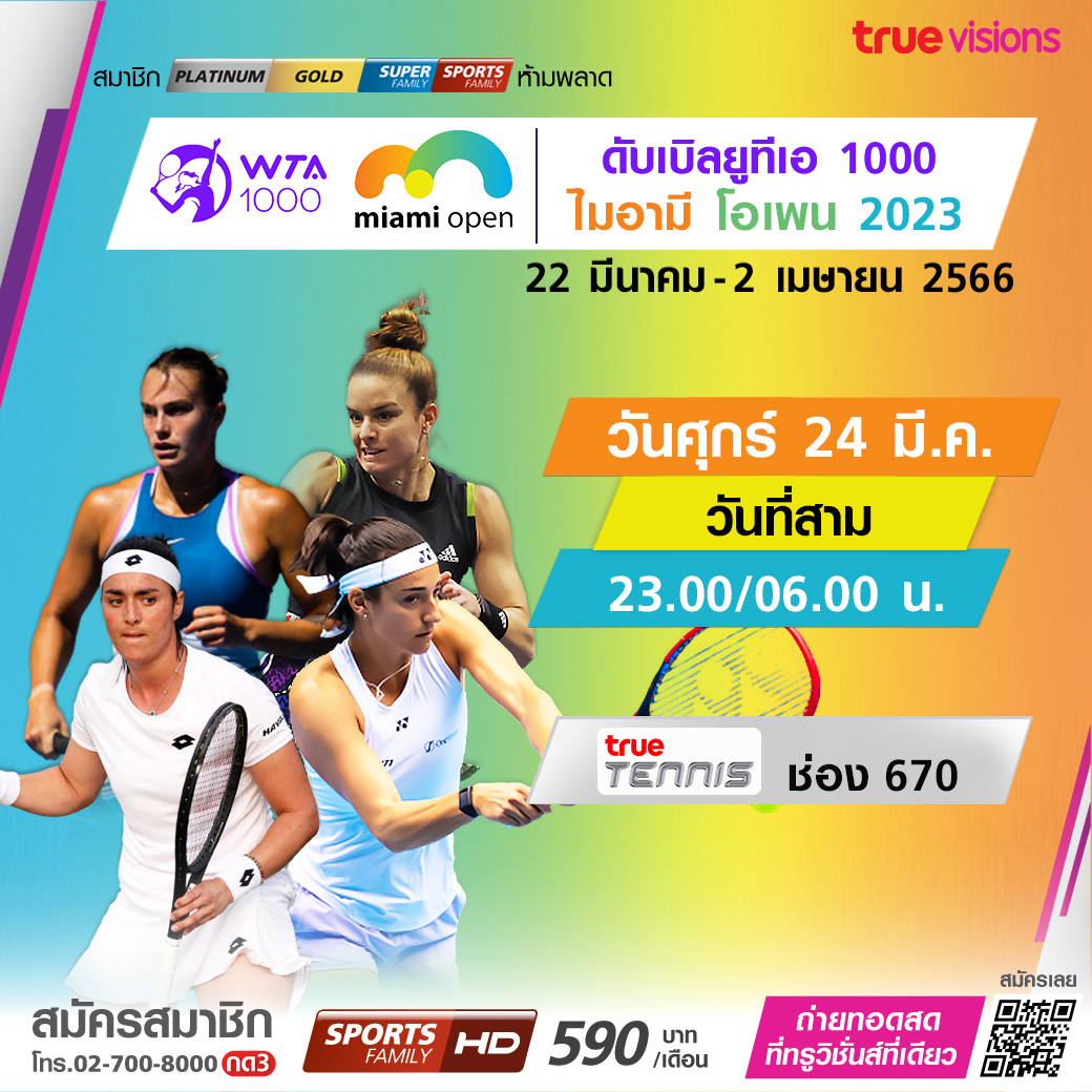 รายการใหญ่สัปดาห์ต่อสัปดาห์ มากันแบบไม่ต้องพัก กับเทนนิสหญิง ดับเบิ้ลยูทีเอ ทัวร์ 1000 ซีรีส์ ไมอามี่ โอเพ่น ชิงเงินรางวัลรวมกว่า 8.8 ล้านเหรียญสหรัฐฯ นักเทนนิสขวัญใจของแฟนๆ มาปะทะฝีมือกัน เพื่อก้าวสู่ตำแหน่งแชมป์ปีนี้ ชมสดครบทุกรอบ