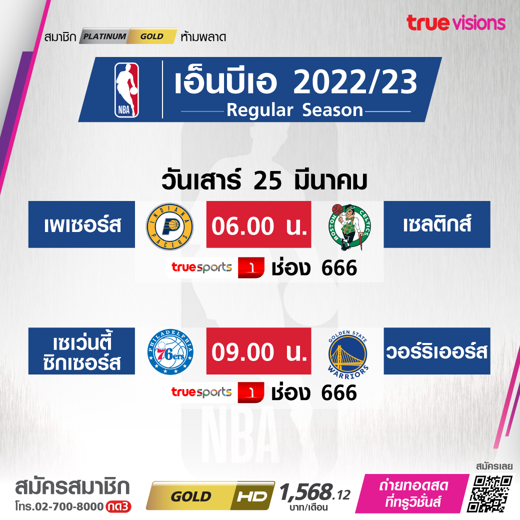 วันเสาร์ 25 มี.ค. 76ERS VsWarriors เวลา 09.00 ทางช่อง TS 1 (666)