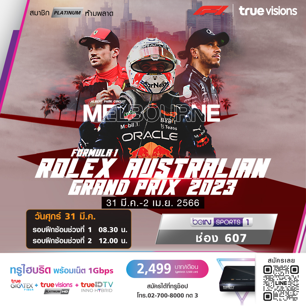 วันนี้มีอะไรดูที่ ทรูวิชั่นส์ ประจำวันพฤหัสบดีที่ 30 มีนาคม 66 ไฮไลท์สำคัญอยู่ที่ศึกฟอร์มูล่า วัน สนามที่ 3 ของฤดูกาล รายการ ออสเตรเลียน กรังด์ปรีซ์ ขณะที่กีฬาอื่นๆ ยังมีเทนนิสรายการใหญ่อย่าง เอทีพี ทัวร์ และ ดับเบิ้ลยูทีเอ ทัวร์ 1000 ซีรีส์ รายการไมอามี่ โอเพ่น, กอล์ฟ พีจีเอ ทัวร์ รายการ วาเลโร เท็กซัส โอเพ่น, กอล์ฟหญิง แอลพีจีเอ ทัวร์ รายการ แอลเอ โอเพ่นล สนุกเกอร์เก็บคะแนนสะสมโลก รายการ ทัวร์ แชมเปี้ยนชิพ และศึกบาสเกตบอล เอ็นบีเอ งานนี้ ทรูวิชั่นส์ จัดเต็มให้ชมกันถึงบ้าน