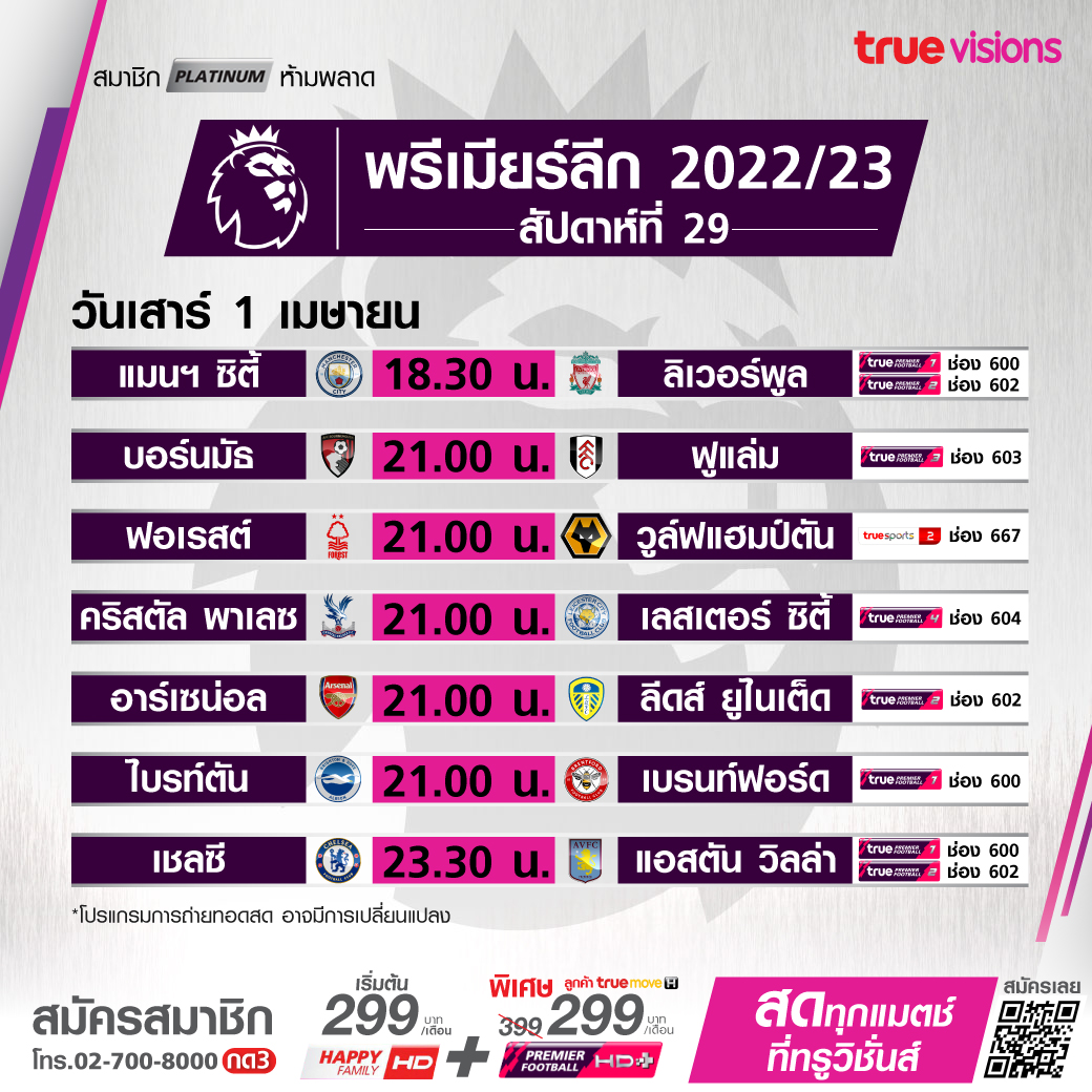 วันนี้มีอะไรดูที่ ทรูวิชั่นส์ ประจำวันเสาร์ที่ 1 เมษายน 66 ในส่วนของฟุตบอลยังมีศึกพรีเมียร์ลีก อังกฤษ, กัลโช่ เซเรีย อา อิตาลี, ลา ลีกา สเปน และ ลีก เอิง ฝรั่งเศส กลับมาให้ได้ตามเชียร์กันอีกครั้ง ส่วนคอมอเตอร์สปอร์ตยังมีศึกโมโต จีพี สนามที่ 2 รายการ กรังด์ปรีซ์ ออฟ อาร์เจนติน่า ขณะที่กีฬาอื่นๆ ยังมีเทนนิสรายการใหญ่อย่าง เอทีพี ทัวร์ และ ดับเบิ้ลยูทีเอ ทัวร์ 1000 ซีรีส์ รายการไมอามี่ โอเพ่น, กอล์ฟ พีจีเอ ทัวร์ รายการ วาเลโร เท็กซัส โอเพ่น, ลิฟ กอล์ฟ รายการ ออร์ลันโด้, กอล์ฟหญิง แอลพีจีเอ ทัวร์ รายการ แอลเอ โอเพ่น, แบดมินตัน บีดับเบิ้ลยูเอฟ มาดริด สเปน มาสเตอร์ส 2023, สนุกเกอร์เก็บคะแนนสะสมโลก รายการ ทัวร์ แชมเปี้ยนชิพ และศึกบาสเกตบอล เอ็นบีเอ งานนี้ ทรูวิชั่นส์ จัดเต็มให้ชมกันถึงบ้าน