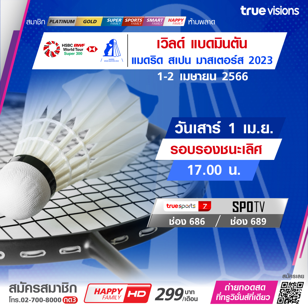 แฟนๆ กีฬาแบดมินตัน มันส์กันต่อกับโปรแกรมใหญ่ รายการระดับเวิลด์ ทัวร์ซูเปอร์ 300 ในทวีปยุโรป กับศึก มาดริด สเปน มาสเตอร์ส 2023 ที่กรุงมาดริด ประเทศสเปน เชียร์นักแบดไทยสู้กับมือพระกาฬจากทั่วโลก ชมสด รอบรองชนะเลิศและชิงชนะเลิศ ชมสด ทาง ทรูวิชั่นส์ ที่เดียว