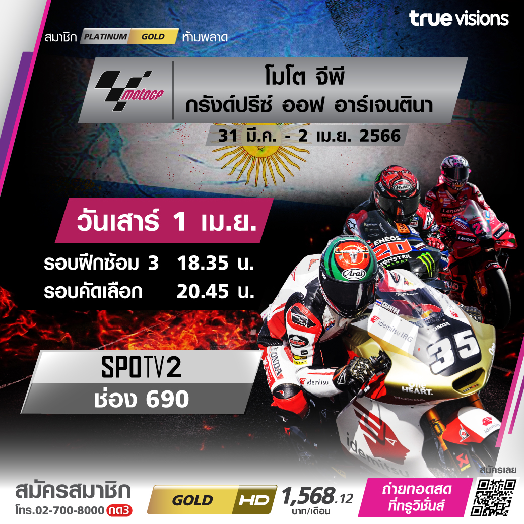 ร้อนทะลุองศาเดือดของช่วงซัมเมอร์ กับศึกจักรยานยนต์ทางเรียบชิงแชมป์โลก โมโต จีพี เวิลด์ แชมเปี้ยนชิพ สนามที่ 2 ของฤดูกาล ไปดวลความเร็วทะลุไมล์กันที่ทวีปอเมริกาใต้ กับศึก กรังด์ปรีซ์ ออฟ อาร์เจนตินา 2023 สดครบทั้ง 3 รุ่น และจุใจทุกช่วง ชมสด ทาง ทรูวิชั่นส์