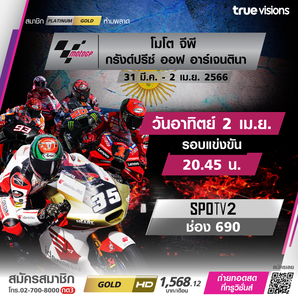 ร้อนทะลุองศาเดือดของช่วงซัมเมอร์ กับศึกจักรยานยนต์ทางเรียบชิงแชมป์โลก โมโต จีพี เวิลด์ แชมเปี้ยนชิพ สนามที่ 2 ของฤดูกาล ไปดวลความเร็วทะลุไมล์กันที่ทวีปอเมริกาใต้ กับศึก กรังด์ปรีซ์ ออฟ อาร์เจนตินา 2023 สดครบทั้ง 3 รุ่น ชมสด ทาง ทรูวิชั่นส์