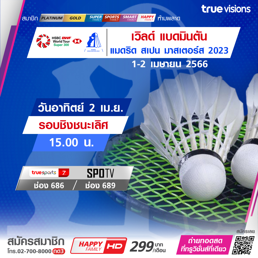 แฟนๆ กีฬาแบดมินตัน มันส์กันต่อกับโปรแกรมใหญ่ รายการระดับเวิลด์ ทัวร์ซูเปอร์ 300 ในทวีปยุโรป กับศึก มาดริด สเปน มาสเตอร์ส 2023 ที่กรุงมาดริด ประเทศสเปน เชียร์นักแบดไทยสู้กับมือพระกาฬจากทั่วโลก ชมสดรอบชิงชนะเลิศ ทาง ทรูวิชั่นส์ ที่เดียว