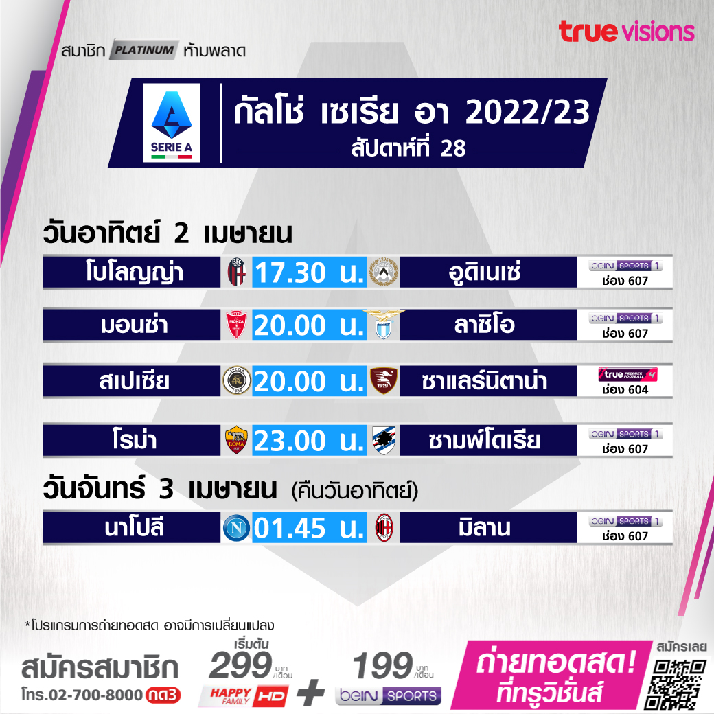 วันนี้มีอะไรดูที่ ทรูวิชั่นส์ ประจำวันอาทิตย์ที่ 2 เมษายน 66 ในส่วนของฟุตบอลยังมีศึกพรีเมียร์ลีก อังกฤษ, กัลโช่ เซเรีย อา อิตาลี, ลา ลีกา สเปน และ ลีก เอิง ฝรั่งเศส กลับมาให้ได้ตามเชียร์กันอีกครั้ง ส่วนคอมอเตอร์สปอร์ตยังมีศึกฟอร์มูล่าวัน สนามที่ 3 ของฤดูกาล รายการ ออสเตรเลียน กรังด์ปรีซ์ และศึกโมโต จีพี สนามที่ 2 รายการ กรังด์ปรีซ์ ออฟ อาร์เจนติน่า ขณะที่กีฬาอื่นๆ ยังมีเทนนิสรายการใหญ่อย่าง เอทีพี ทัวร์ 1000 ซีรีส์ รายการไมอามี่ โอเพ่น, กอล์ฟ พีจีเอ ทัวร์ รายการ วาเลโร เท็กซัส โอเพ่น, ลิฟ กอล์ฟ รายการ ออร์ลันโด้, กอล์ฟหญิง แอลพีจีเอ ทัวร์ รายการ แอลเอ โอเพ่น, แบดมินตัน บีดับเบิ้ลยูเอฟ มาดริด สเปน มาสเตอร์ส 2023, สนุกเกอร์เก็บคะแนนสะสมโลก รายการ ทัวร์ แชมเปี้ยนชิพ และศึกบาสเกตบอล เอ็นบีเอ งานนี้ ทรูวิชั่นส์ จัดเต็มให้ชมกันถึงบ้าน