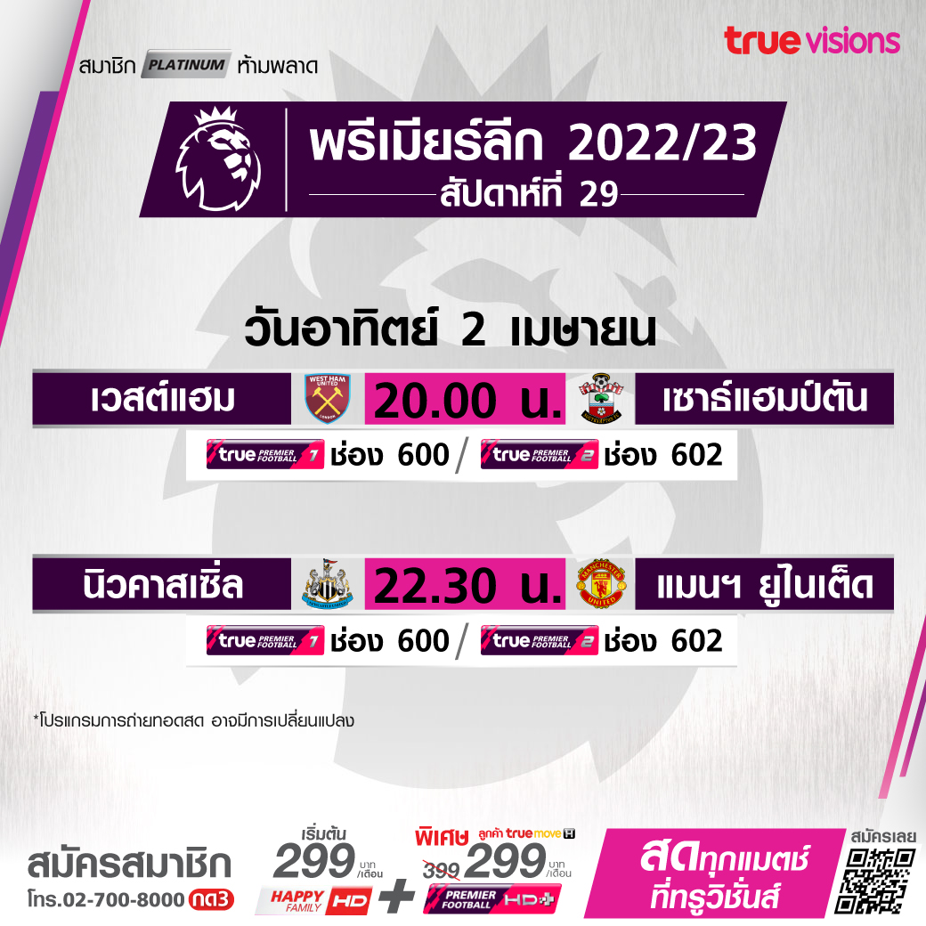 West Ham Utd vs Southampton เวลา 20:00 - 22:00 ทางช่อง TPF 1(600) / TPF 2 (602)