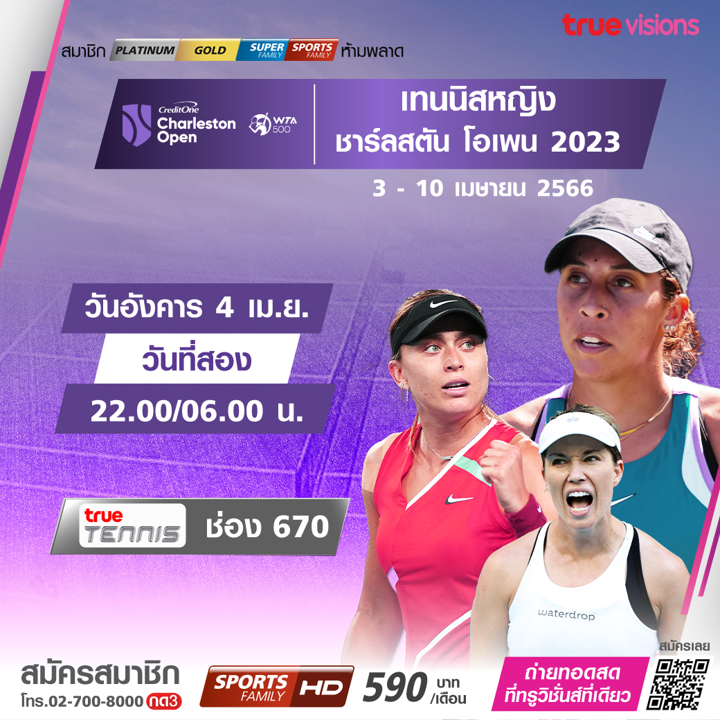 เทนนิสหญิง ดับเบิลยูทีเอ ทัวร์ ระดับ 500 ซีรี่ส์ ที่ประเดิมเคลย์คอร์ตสัปดาห์แรกกับรายการ ชาร์ลส์ตัน โอเพ่น มือดังๆ ของโลกร่วมแข่งขันและลุ้นแชมป์กันคับคั่ง ที่ ชาร์ลส์ตัน สหรัฐอเมริกา ชมสด ครบทุกรอบ ชมสด ทาง ทรูวิชั่นส์ ที่เดียว