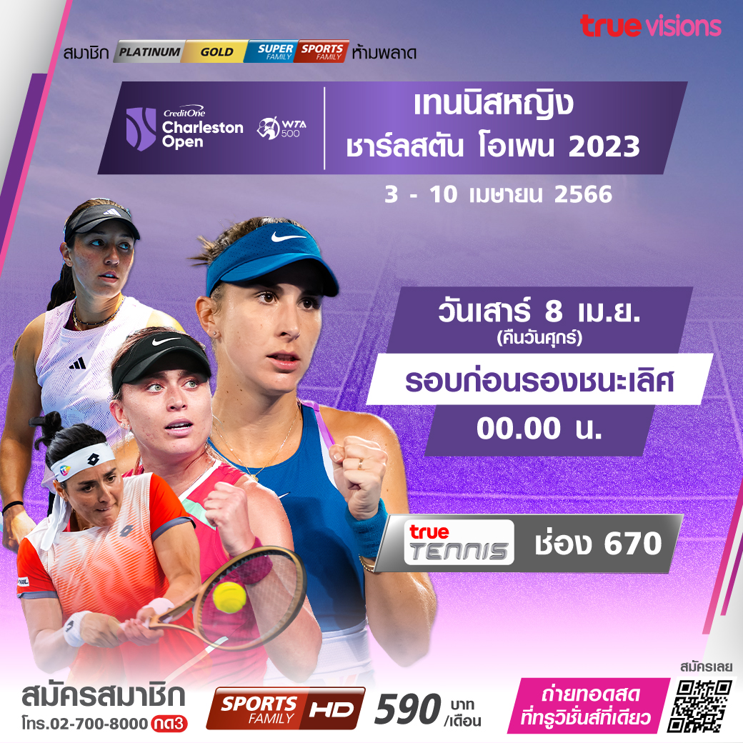 เทนนิสหญิง ดับเบิลยูทีเอ ทัวร์ ระดับ 500 ซีรี่ส์ ที่ประเดิมเคลย์คอร์ตสัปดาห์แรกกับรายการ ชาร์ลส์ตัน โอเพ่น มือดังๆ ของโลกร่วมแข่งขันและลุ้นแชมป์กันคับคั่ง ที่ ชาร์ลส์ตัน สหรัฐอเมริกา ชมสด ครบทุกรอบ ชมสด ทาง ทรูวิชั่นส์ ที่เดียวรอบก่อนรองชนะเลิศ เวลา 00.00 ทางช่อง True Tennis (670)