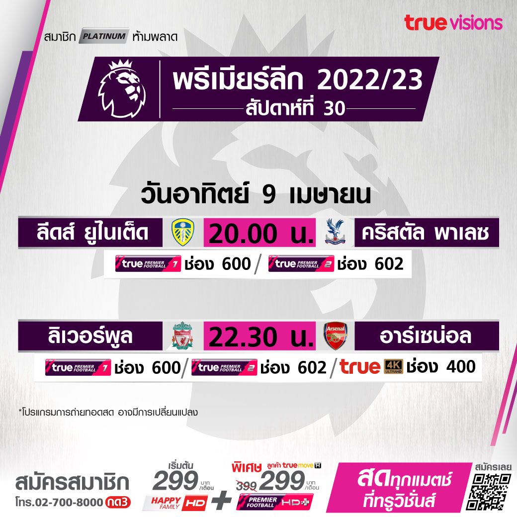 Liverpool vs Arsenal เวลา 22:30 - 00:30 ทางช่องTPF 1(600) / TPF 2 (602) / 4K (400)