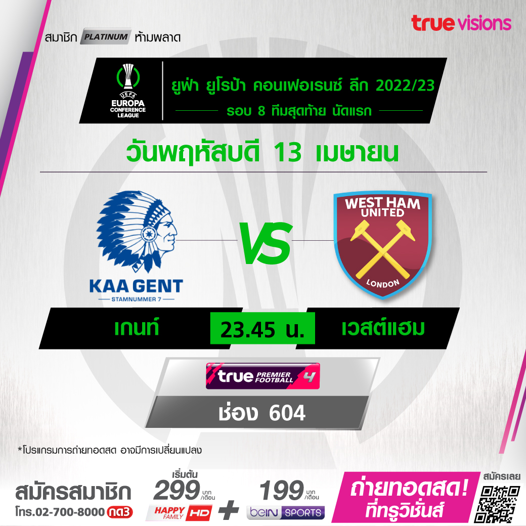 Gent vs West Ham เวลา 23.45-01.45 ทางช่อง TPF 4 (604)