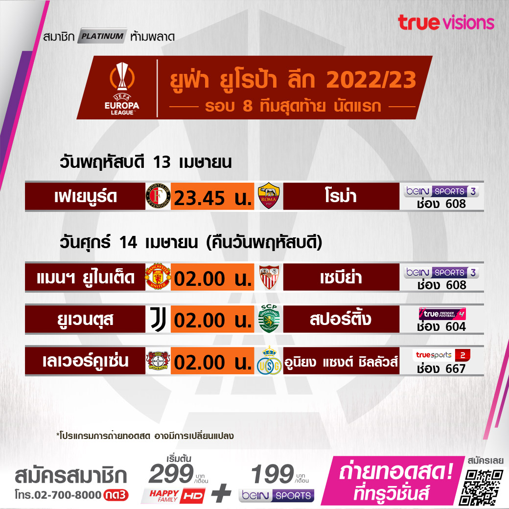 วันนี้มีอะไรดูที่ ทรูวิชั่นส์ ประจำวันพฤหัสบดีที่ 13 เมษายน 66 ในส่วนของฟุตบอลยังมีศึกยูฟ่า ยูโรป้า ลีก และ ยูโรป้า คอนเฟอเรนซ์ ลีก ที่เดินทางมาถึงในรอบ 8 ทีมสุดท้ายแล้ว ขณะที่กีฬาอื่นๆ ยังมีศึกเทนนิส เอทีพี ทัวร์ รายการ มอนติ คาร์โล มาสเตอร์ส, กอล์ฟพีจีเอ ทัวร์ รายการ อาร์บีซี เฮอร์ริเทจ, เอเชี่ยน ทัวร์ อินเตอร์เนชั่นแนล ซีรี่ส์ เวียดนาม และ กอล์ฟหญิง แอลพีจีเอ ทัวร์ รายการ ล็อตเต้ แชมเปี้ยนชิพ งานนี้ ทรูวิชั่นส์ จัดเต็มให้ชมกันถึงบ้าน