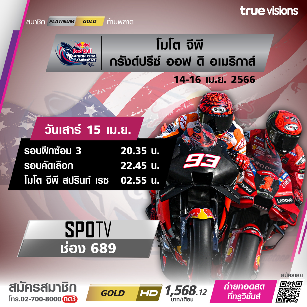 แฟนๆ กีฬาความเร็วไปมันส์ต่อกับศึกโมโต จีพี สนามที่ 3 ของฤดูกาล 2023 รายการ กรังด์ปรีซ์ ออฟ ดิ อเมริกาส์ ที่สังเวียน เซอร์กิต ออฟ ดิ อเมริกาส์ ที่เมืองออสติน รัฐเท็กซัส ประเทศสหรัฐฯ ชมสดจุใจ ครบทุกช่วงทั้ง 3 รุ่น โมโต 3, โมโต 2 และ โมโต จีพี ร่วมลุ้นกันว่าใครจะผงาดบนโพเดียมเมื่อจบการแข่งขัน ชมสด ทาง ทรูวิชั่นส์