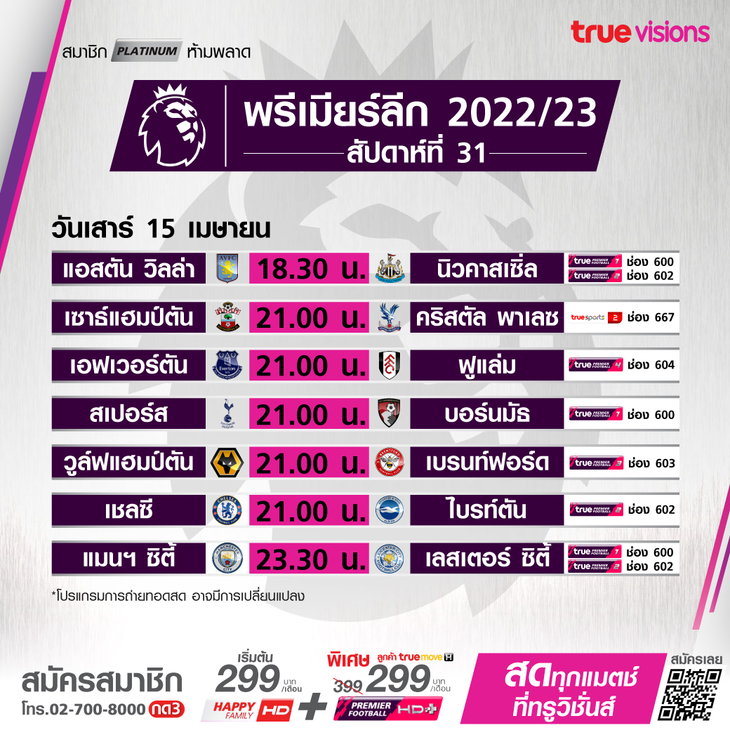 วันนี้มีอะไรดูที่ ทรูวิชั่นส์ ประจำวันเสาร์ที่ 15 เมษายน 66 ในส่วนของฟุตบอลยังมีศึกพรีเมียร์ลีก อังกฤษ, กัลโช่ เซเรีย อา อิตาลี, ลา ลีกา สเปน และ ลีก เอิง ฝรั่งเศส ให้ได้ตามเชียร์กันอย่างต่อเนื่อง ขณะที่กีฬาอื่นๆ คอมอเตอร์สปอร์ตพลาดไม่ได้ กับศึก โมโต จีพี สนามที่ 3 รายการ กรังด์ปรีซ์ ออฟ ดิ อเมริกาส์, ศึกเทนนิส เอทีพี ทัวร์ รายการ มอนติ คาร์โล มาสเตอร์ส, กอล์ฟพีจีเอ ทัวร์ รายการ อาร์บีซี เฮอร์ริเทจ, เอเชี่ยน ทัวร์ อินเตอร์เนชั่นแนล ซีรี่ส์ เวียดนาม, กอล์ฟหญิง แอลพีจีเอ ทัวร์ รายการ ล็อตเต้ แชมเปี้ยนชิพ, ศึกบาสเกตบอล เอ็นบีเอ และอื่นๆ อีกมาก งานนี้ ทรูวิชั่นส์ จัดเต็มให้ชมกันถึงบ้าน