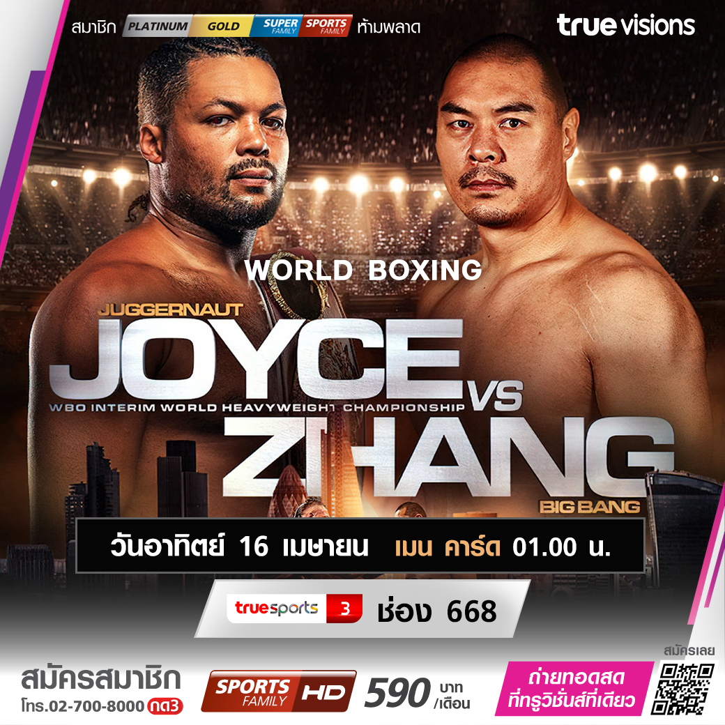 ความร้อนแรงของวงการหมัดมวยระดับโลกมาเยือนเมืองไทยอีกครั้งกับ เวิลด์ บ็อกซิ่ง แชมเปี้ยนชิพ จากประเทศอังกฤษ คู่เอก เป็นการปะทะกันของสองนักมวยรุ่นยักษ์ โจ จ๊อยส์ นักชกเจ้าถิ่น ขึ้นเวที ป้องกันแชมป์รุ่นเฮฟวี่เวต สถาบัน WBO กับ ผู้ท้าชิงจากประเทศจีน จาง จื้อเล่ย สดจาก ค็อปเปอร์ บ็อกซ์ อารีน่า ชมสด ทาง ทรูวิชั่นส์ ที่เดียว