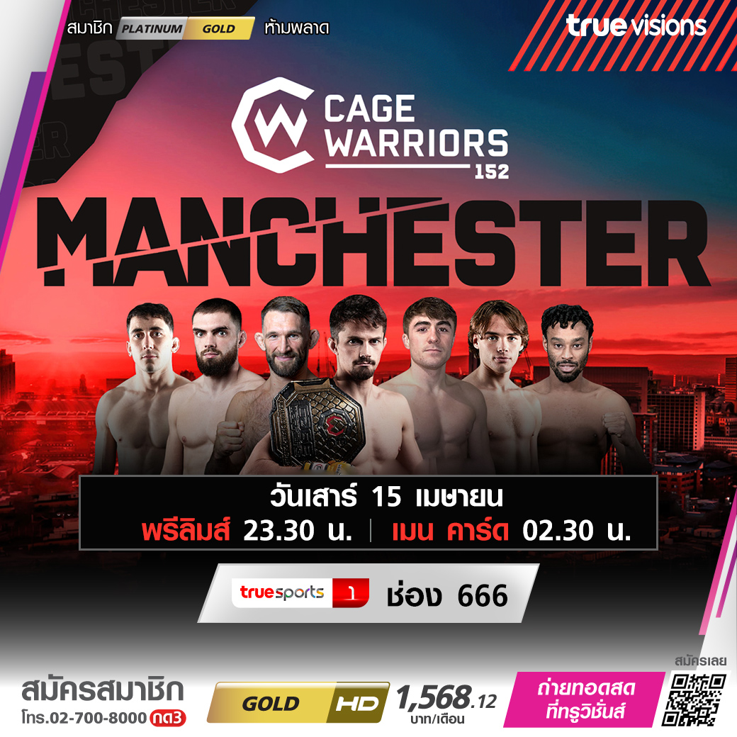 แฟนๆ พลาดไม่ได้ ความมันส์ ดุเดือดของกีฬาต่อสู้ในรูปแบบ เคจ วอร์ริเออร์ส ส่งตรงจากอังกฤษ กับศึก เคจ วอร์ริเออร์ส 152 คู่เอก จอร์จ ฮาร์ดวิค ป้องกันแชมป์ไลต์เวต กับ ยานน์ ลิอาซซี่ พร้อมมวยคู่มันส์ๆ กว่า 10 คู่ ในช่วงพรีลิมส์ และ เมนคาร์ด สด จาก บีอีซี อารีน่า เมืองแมนเชสเตอร์