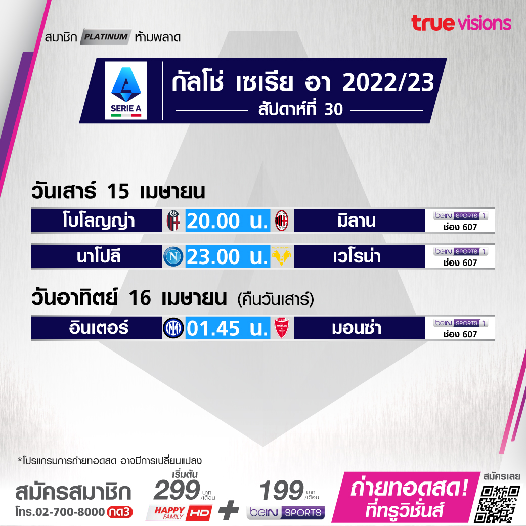 Inter vs Monza เวลา 01.45-03.45 ทางช่อง beIN 1 (607)