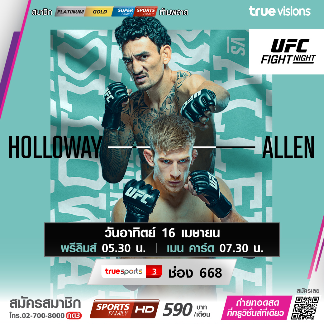 สังเวียนนักสู้ตัวจริงที่แฟนๆ ติดตามกันอย่างเหนียวแน่น ยูเอฟซี ไฟต์ไนท์ สัปดาห์นี้ ไปมันส์กันที่ ที-โมบาย เซนเตอร์ในแคนซัส ซิตี้ สหรัฐอเมริกา คู่เอก อดีตแชมป์เฟเธอร์เวต แม็กซ์ ฮอลโลเวย์ พบ สุดยอดนักสู้ฟอร์มแรงจากเมืองผู้ดี อาร์โนลด์ อัลเลน ร่วมด้วยคู่ประกอบรายการมันส์ๆ อีกหลายคู่ ชมสด ทาง ทรูวิชั่นส์ ที่เดียว