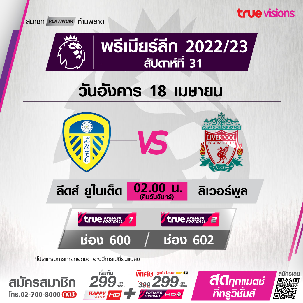 Leeds Utd vs Liverpool เวลา 02:00 - 04:00 ทางช่อง TPF 1 (600) / TPF 2 (602)
