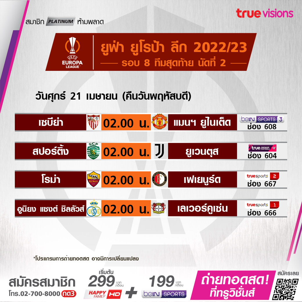 วันนี้มีอะไรดูที่ ทรูวิชั่นส์ ประจำวันพฤหัสบดีที่ 20 เมษายน 66 ในส่วนของฟุตบอลยังมีศึกยูฟ่า ยูโรป้า ลีก และ ยูโรป้า คอนเฟอเรนซ์ ลีก รอบ 8 ทีมสุดท้ายนัดที่สอง ให้ได้ตามเชียร์กันอย่างต่อเนื่อง ขณะที่กีฬาอื่นๆ ยังมีศึกเทนนิส เอทีพี ทัวร์ รายการ บาร์เซโลน่า โอเพ่น, เทนนิสหญิง ดับเบิ้ลยูทีเอ ทัวร์ รายการ สตุ๊ตการ์ท เทนนิส กรังด์ปรีซ์, กอล์ฟ พีจีเอ ทัวร์ รายการ ซูริค คลาสสิก ออฟ นิว ออร์ลีนส์, ลิฟ กอล์ฟ 2023, แอลพีจีเอ ทัวร์ รายการ เดอะ เชฟรอน แชมเปี้ยนชิพ, สนุกเกอร์ชิงแชมป์โลก เวิลด์ แชมเปี้ยนชิพ และบาสเกตบอล เอ็นบีเอ รอบเพลย์ออฟ งานนี้ ทรูวิชั่นส์ จัดเต็มให้ชมกันถึงบ้าน