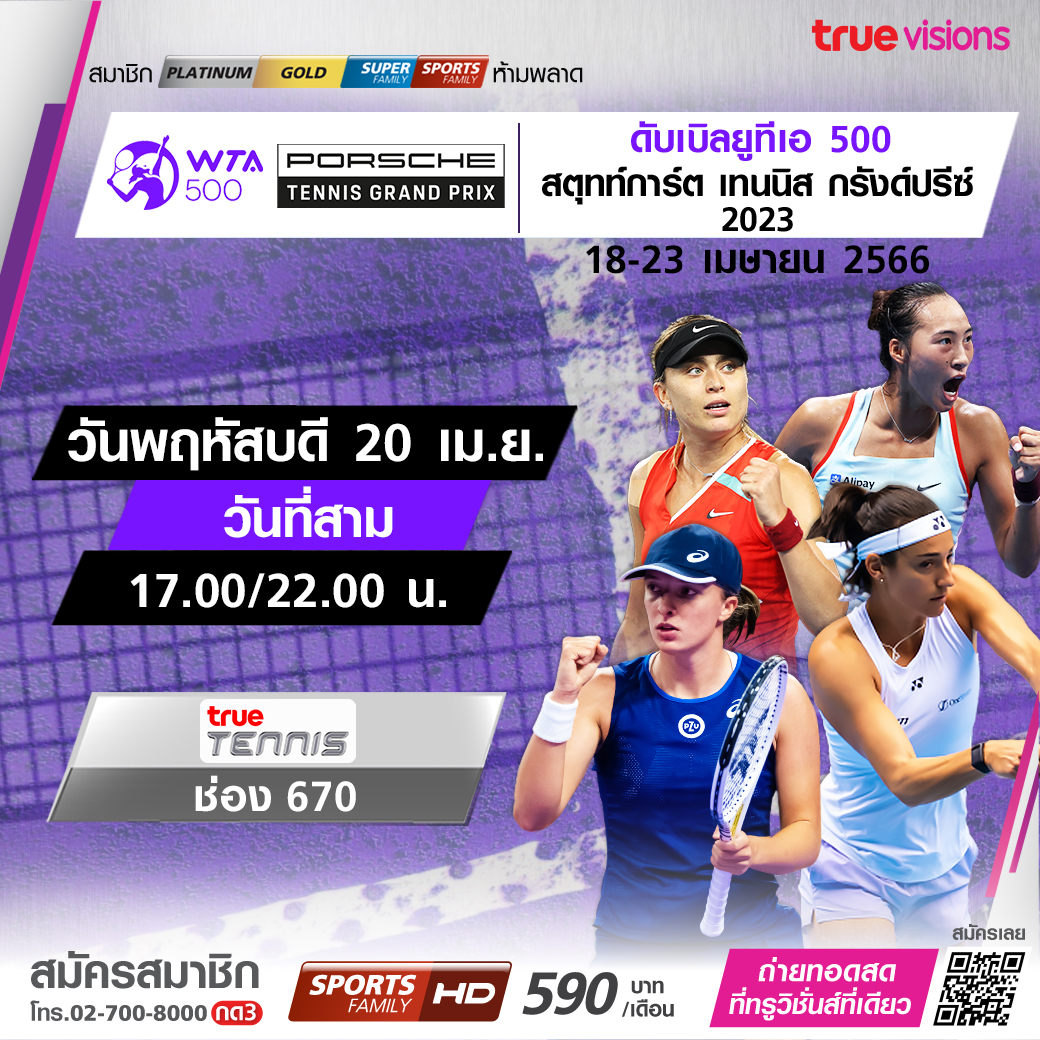 เทนนิสหญิงดับเบิลยูทีเอ ทัวร์ 500 ซีรี่ส์ สัปดาห์นี้ นักเทนนิสสาวระดับท็อปของโลก ไปรวมตัวกันที่ สตุ๊ตการ์ท ประเทศเยอรมนี เพื่้อร่วมแข่งขันและลุ้นแชมป์ในรายการ สตุ๊ตการ์ท เทนนิส กรังด์ปรีซ์ ชมสด ครบทุกรอบ ชมสด ทาง ทรูวิชั่นส์ ที่เดียว