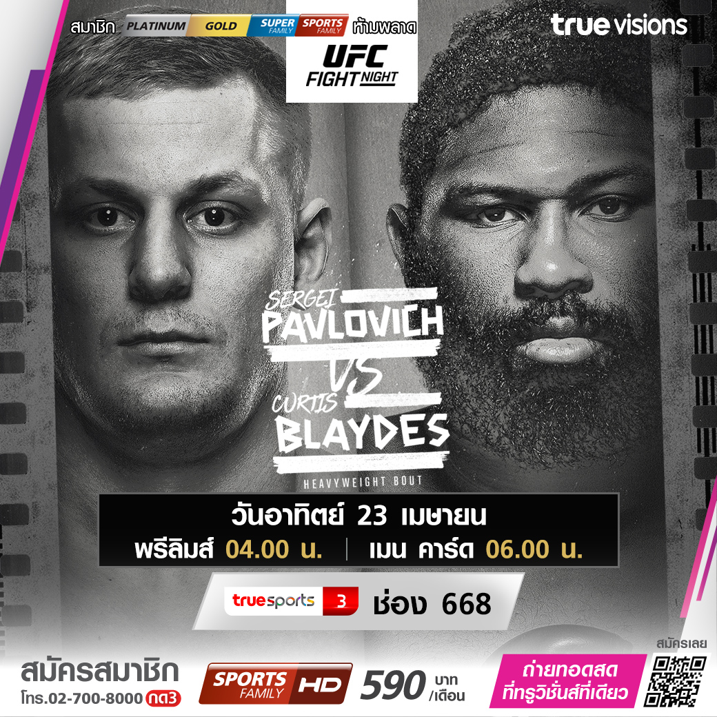 แฟนๆ ยูเอฟซี ห้ามพลาด เมื่อยูเอฟซี ไฟต์ ไนท์ จัดรุ่นใหญ่นักสู้เฮฟวี่เวตมาวัดฝีมือกัน ระหว่าง เซอร์เก พาฟลวิช ขาโหดของวงการจากแดนหมีขาวรัสเซีย ปะทะ เคอร์ติส เบลดส์ อเมริกันพันธุ์ดุ ชมสด จุใจ ตั้งแต่ช่วงพรีลิมส์ ถึง เมน คาร์ด นับ 10 คู่ ชมสด ทาง ทรูวิชั่นส์ ที่เดียว