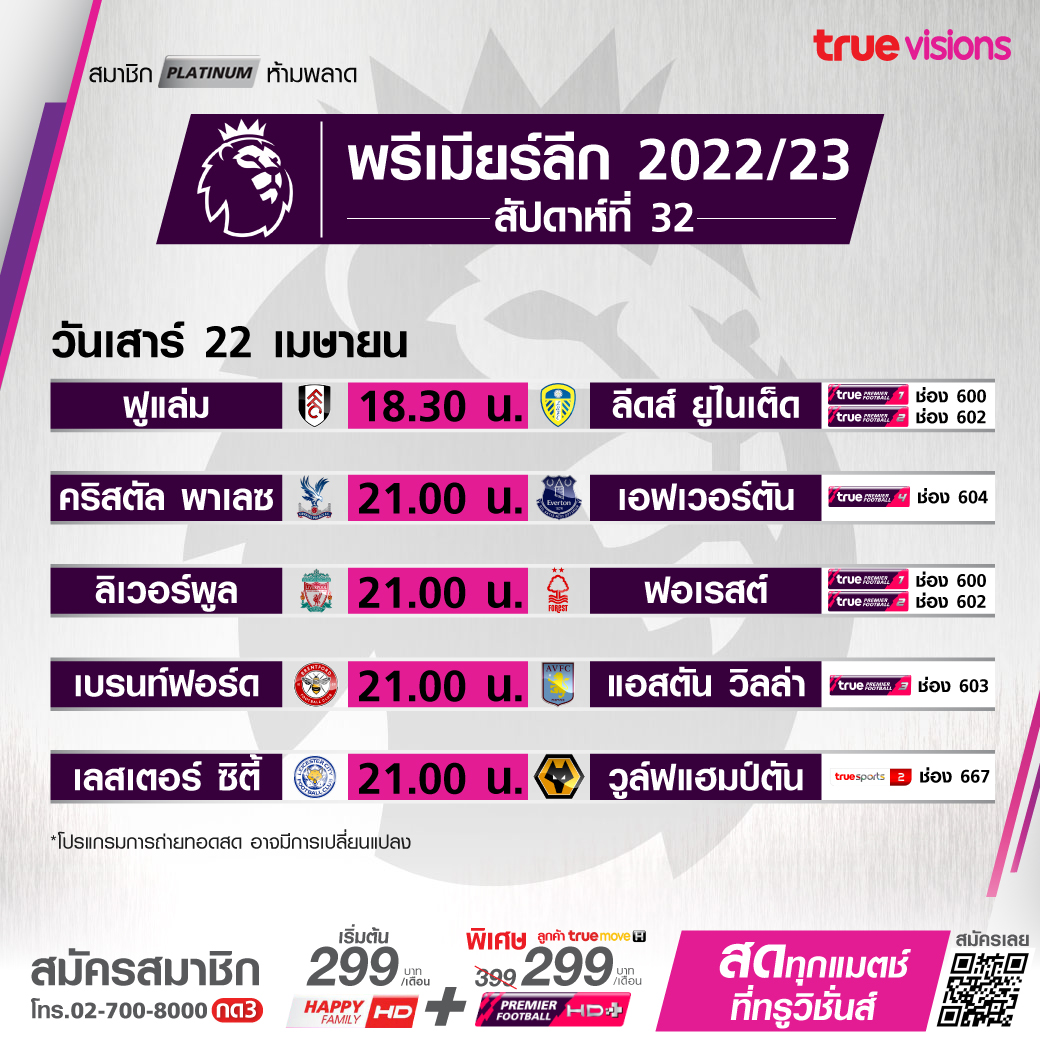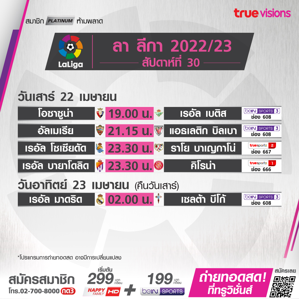 วันนี้มีอะไรดูที่ ทรูวิชั่นส์ ประจำวันเสาร์ที่ 22 เมษายน 66 ในส่วนของฟุตบอลยังมีศึกพรีเมียร์ลีก อังกฤษ, เอฟเอ คัพ, กัลโช่ เซเรีย อา อิตาลี, ลา ลีกา สเปน และ ลีก เอิง ฝรั่งเศส ให้ได้ตามเชียร์กันอย่างต่อเนื่อง ขณะที่กีฬาอื่นๆ ยังมีศึกเทนนิส เอทีพี ทัวร์ รายการ บาร์เซโลน่า โอเพ่น, เทนนิสหญิง ดับเบิ้ลยูทีเอ ทัวร์ รายการ สตุ๊ตการ์ท เทนนิส กรังด์ปรีซ์, กอล์ฟ พีจีเอ ทัวร์ รายการ ซูริค คลาสสิก ออฟ นิว ออร์ลีนส์, ลิฟ กอล์ฟ 2023, แอลพีจีเอ ทัวร์ รายการ เดอะ เชฟรอน แชมเปี้ยนชิพ, สนุกเกอร์ชิงแชมป์โลก เวิลด์ แชมเปี้ยนชิพ, ยูเอฟซี ไฟต์ ไนท์ และบาสเกตบอล เอ็นบีเอ รอบเพลย์ออฟ งานนี้ ทรูวิชั่นส์ จัดเต็มให้ชมกันถึงบ้าน