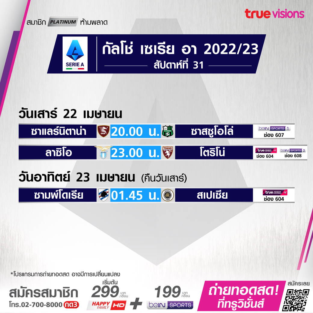 Salernitana vs Sassuolo เวลา 20.00-22.00 ทางช่อง beIN 1 (607)