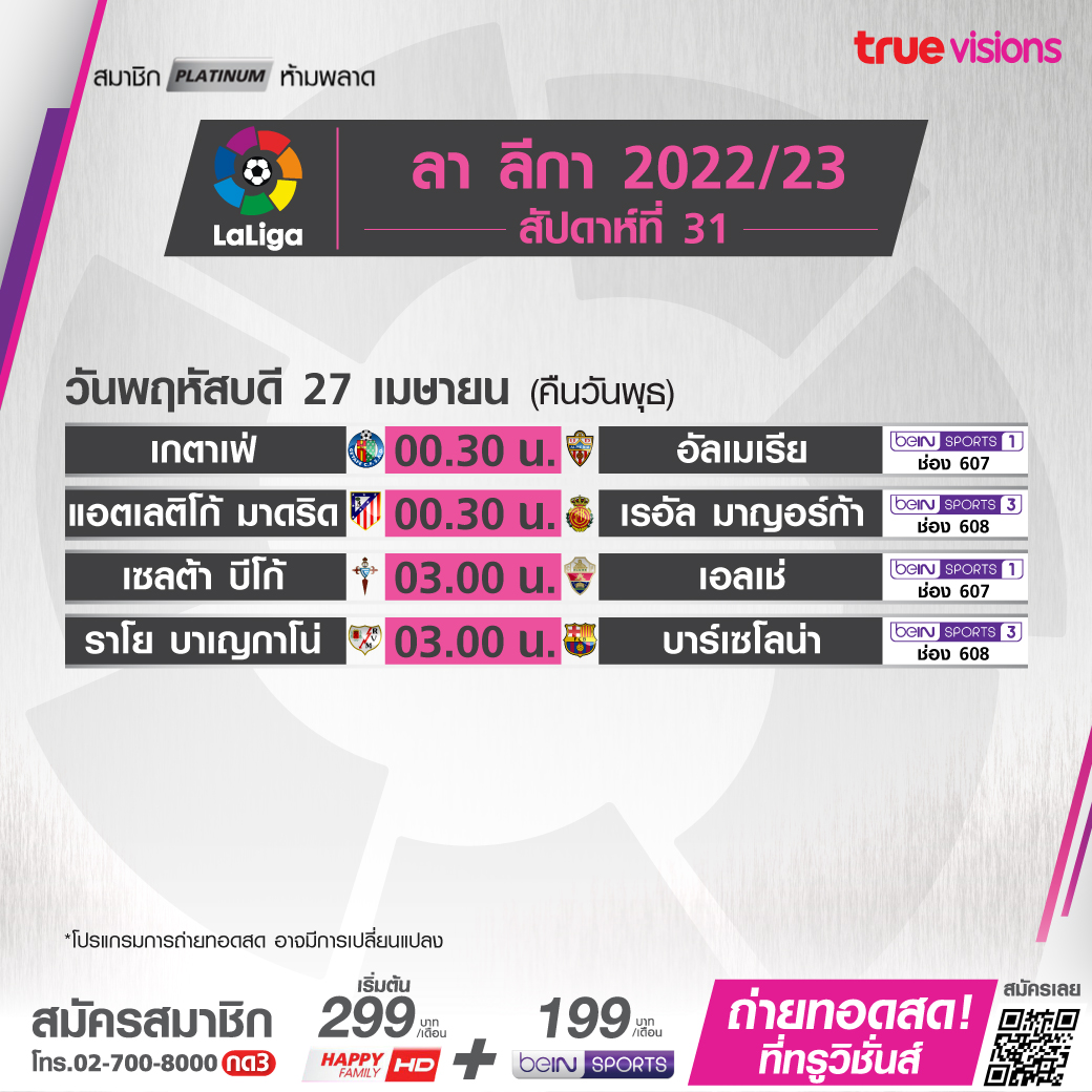 Getafe vs Almeria เวลา 00.30-02.30 ทางช่อง beIN 1 (607)