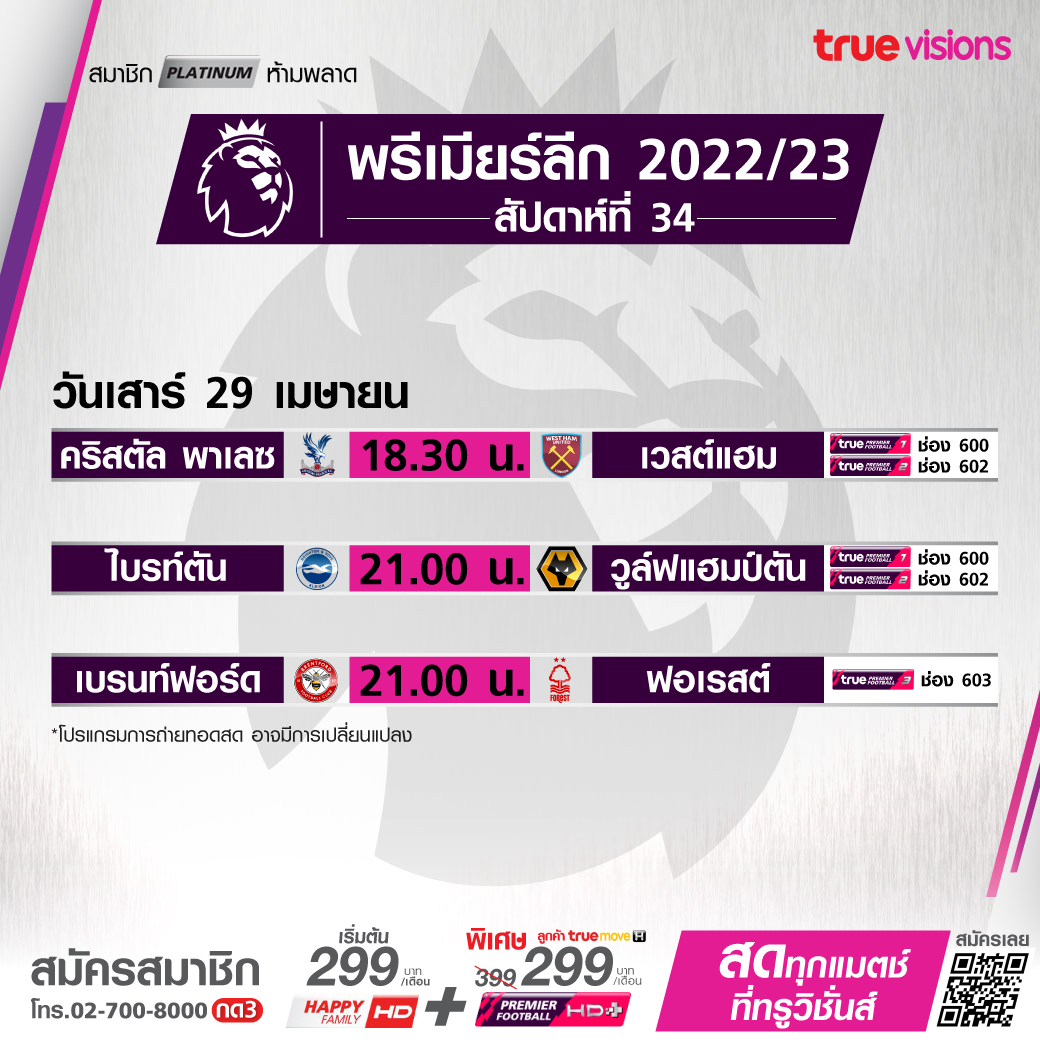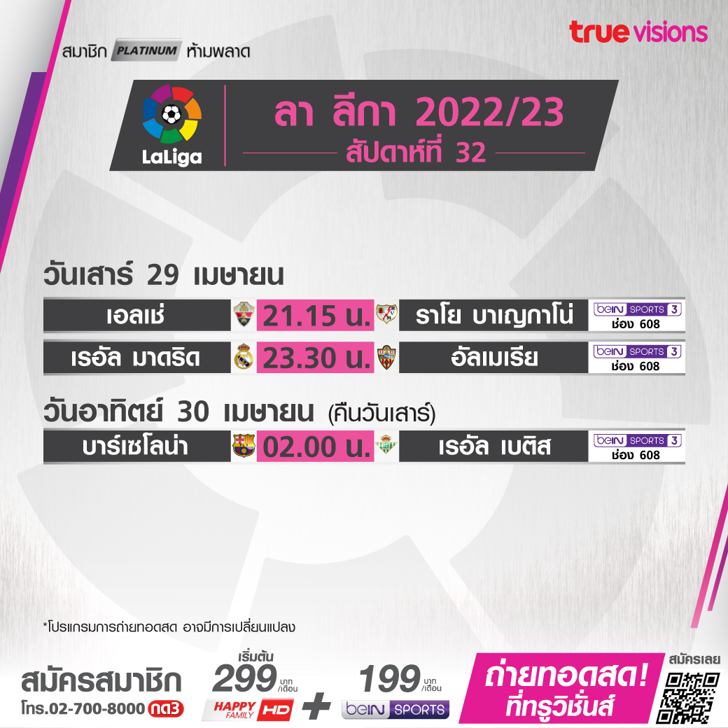 วันนี้มีอะไรดูที่ ทรูวิชั่นส์ ประจำวันเสาร์ที่ 29 เมษายน 66 ในส่วนของฟุตบอลยังมีศึกพรีเมียร์ลีก อังกฤษ, กัลโช่ เซเรีย อา อิตาลี, ลา ลีกา สเปน และ ลีก เอิง ฝรั่งเศส ให้ได้ตามเชียร์กันอย่างต่อเนื่อง ขณะที่กีฬาอื่นๆ ยังมีศึกฟอร์มูล่า วัน รายการ อาเซอร์ไบจัน กรังด์ปรีซ์, ศึกโมโต จีพี รายการ สแปนิช กรังด์ปรีซ์, ศึกเทนนิส เอทีพี ทัวร์ และดับเบิ้ลยูทีเอ ทัวร์ 1000 ซีรี่ส์ รายการ มาดริด โอเพ่น, กอล์ฟ พีจีเอ ทัวร์ รายการเม็กซิโก โอเพ่น, ลิฟ กอล์ฟ สิงคโปร์, กอล์ฟหญิง แอลพีจีเอ ทัวร์ รายการ แอลเอ แชมเปี้ยนชิพ, การแข่งขันสนุกเกอร์ชิงแชมป์โลก เวิลด์ แชมเปี้ยนชิพ, แบดมินตัน เอเชีย แชมเปี้ยนชืพ, ศึกเวิลด์ เทเบิล เทนนิส รายการ สตาร์ คอนเทนเดอร์ แบงค็อก 2023, ยูเอฟซี ไฟท์ ไนต์ และศึกบาสเกตบอล เอ็นบีเอ เพลย์ออฟ งานนี้ ทรูวิชั่นส์ จัดเต็มให้ชมกันถึงบ้าน