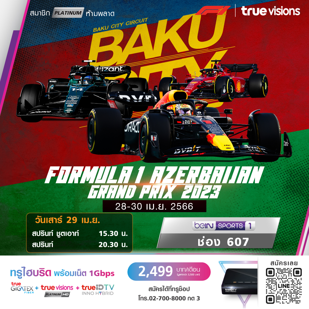 แฟนๆ กีฬาผู้รักความเร็ว กลับมามันส์สะใจกันต่อกับสุดยอดมอเตอร์สปอร์ตอันดับ 1 ของโลก ฟอร์มูล่า วัน เวิลด์ แชมเปี้ยนชิพ สนามที่ 4 ของฤดูกาล 2023 อาเซอร์ไบจัน กรังด์ปรีซ์ สัมผัสประสบการณ์สุดตื่นเต้นเร้าใจครบทุกช่วงของการแข่งขัน ใครจะเป็นแชมป์สนามนี้ ชมสด ทาง ทรูวิชั่นส์ ที่เดียว
