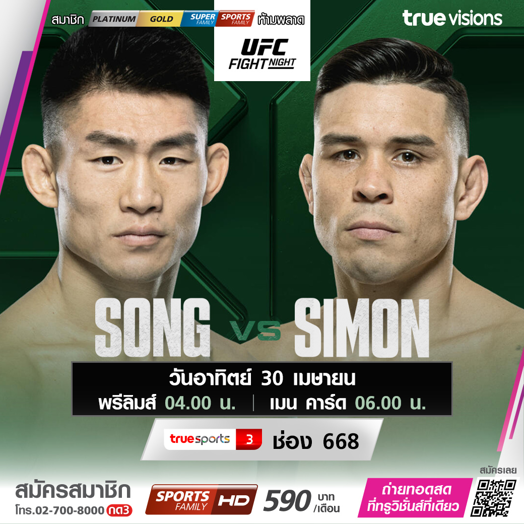 ความมันระดับ 5 ดาวจาก อัลติเมต ไฟต์ติ้ง แชมเปี้ยนชิพ สัปดาห์นี้ ที่สังเวียน ยูเอฟซี เอเพ็กซ์ ลาสเวกัส จะเป็นการพิสูจน์ฝีมือของเหล่าบรรดานักสู้กรงเหล็ก ในยูเอฟซี ไฟต์ ไนท์ คู่เอกเป็นการปะทะกันในรุ่นแบนตั้มเวต นักหว่าง ซ่ง หย่าตง นักสู้อันตรายจากจีนแผ่นดินใหญ่ กับอเมริกันพันธุ์โหด ริกกี้ ไซมอน ชมสด ทาง ทรูวิชั่นส์ ที่เดียว