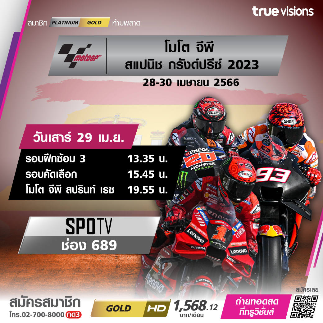 มันส์สนุกเร้าใจทุกครั้งที่ โมโต จีพี กลับไปแข่งในดินแดนกระทิงดุสเปน สัปดาห์นี้ ลุ้นและเชียร์ติดขอบแทรค เฆเรซ เซอร์กิต กับลีลาระดับเทพของ นักบิดชั้นนำของโลกทั้ง โมโต 3, โมโต 2 และสุดๆ กับ โมโต จีพี ในศึก สแปนิช กรังด์ปรีซ์ 2023 สดครบทุกช่วงของการแข่งขัน ชมสด ทาง ทรูวิชั่นส์