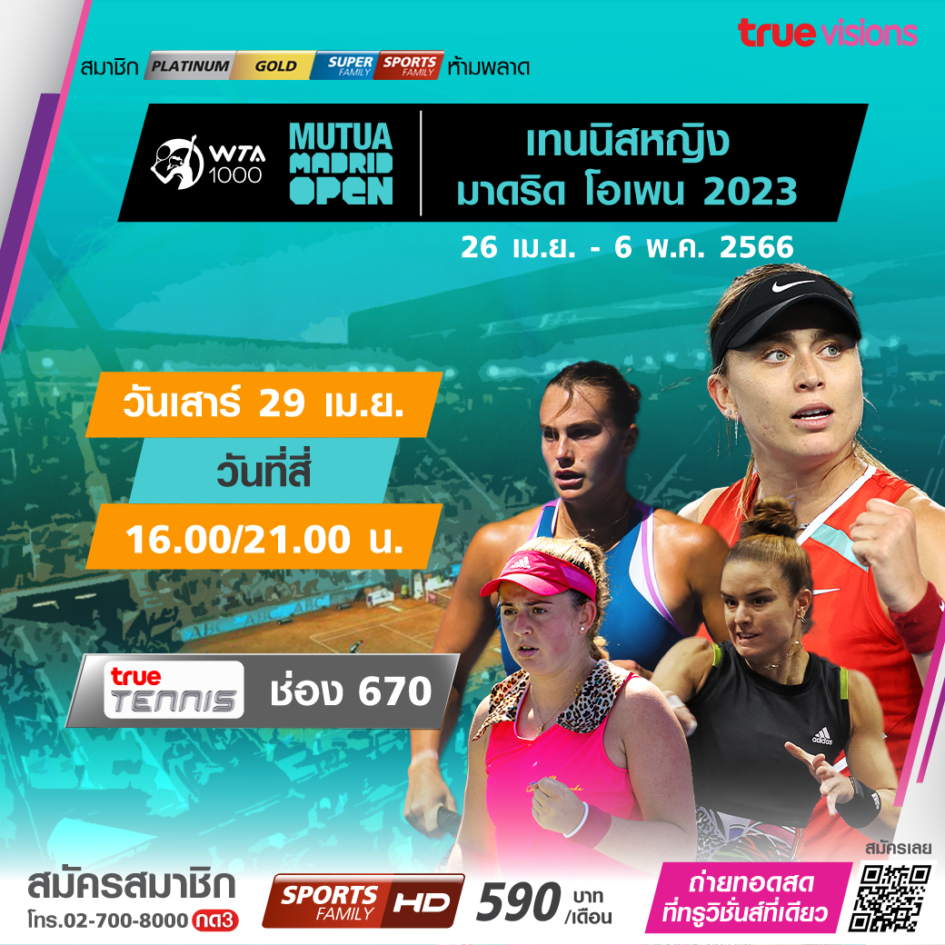 เทนนิสหญิงดับเบิ้ลยูทีเอ ทัวร์ 1000 ซีรี่ส์ มาดริด โอเพ่น 2023 ดวลเดือดกันตั้งแต่รอบแรกถึงรอบชิงชนะเลิศ ใครจะยืนหนึ่งประกาศศักดาเป็นแชมป์ปีนี้ ชมสด ทาง ทรูวิชั่นส์ ที่เดียว