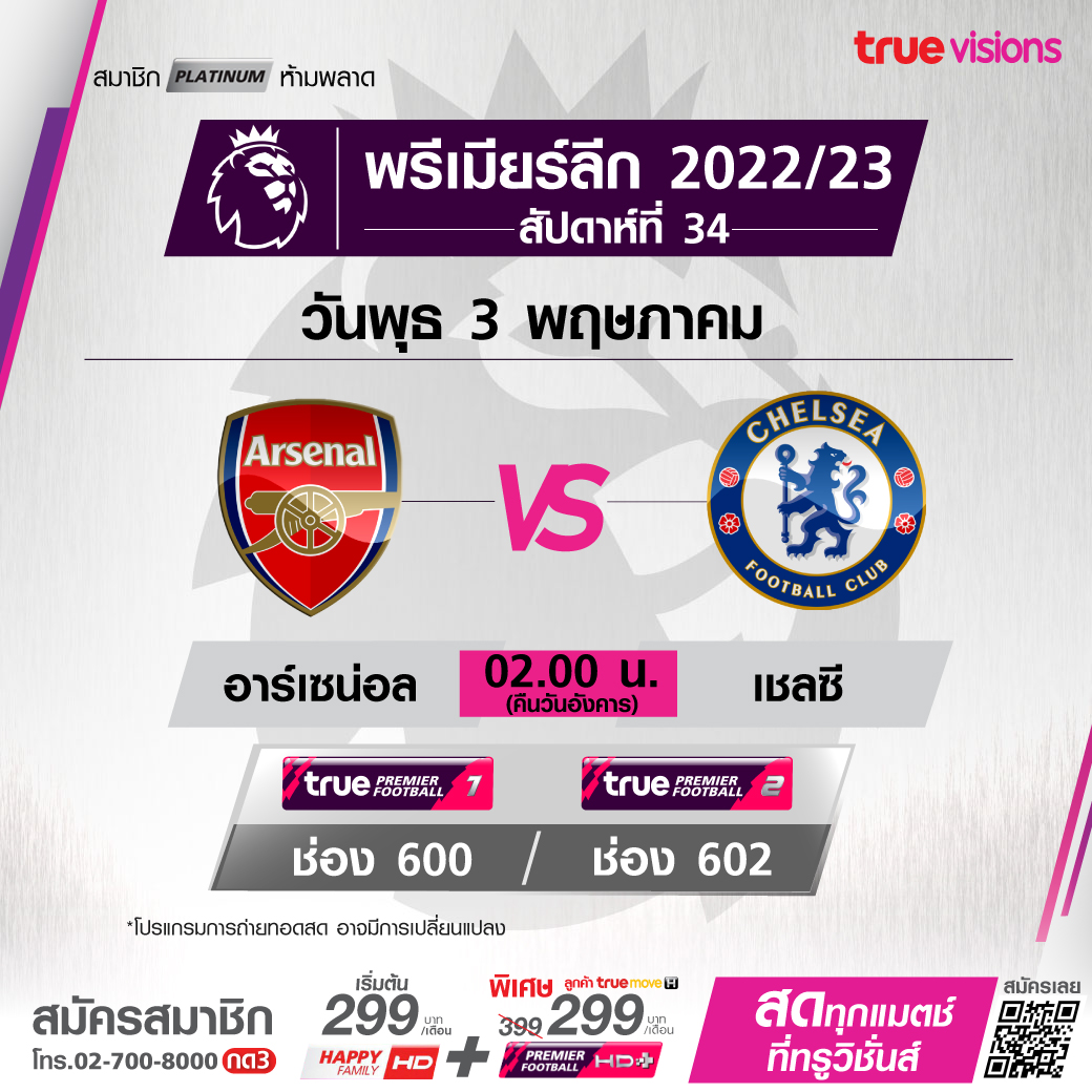 Arsenal vs Chelsea เวลา 02:00 - 04:00 ทางช่อง TPF 1 (600)/ TPF 2 (602)