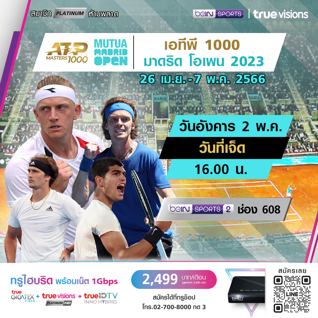 เทนนิสชายจาก เอทีพี ทัวร์ ลุ้นเป็นแชมป์รายการที่ยิ่งใหญ่ เวิลด์ ทัวร์ 1000 ซีรี่ส์ มาดริด โอเพ่น ใครดี ใครอยู่ และใครจะคว้าตำแหน่งแชมป์ปีนี้ ชมสด จุใจ ทุกรอบ ชมสด ทาง ทรูวิชั่นส์ ที่เดียว