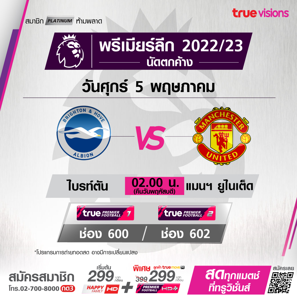 Brighton vs Man Utd เวลา 02:00 - 04:00 ทางช่อง TPF 1(600) / TPF 2 (602)