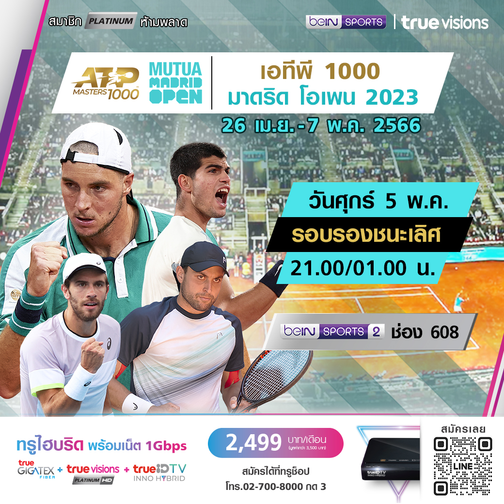 เทนนิสชายจาก เอทีพี ทัวร์ ลุ้นเป็นแชมป์รายการที่ยิ่งใหญ่ เวิลด์ ทัวร์ 1000 ซีรี่ส์ มาดริด โอเพ่น มาถึงในรอบรองชนะเลิศ ใครดี ใครอยู่ และใครจะคว้าตำแหน่งแชมป์ปีนี้ ชมสด จุใจ ทุกรอบ ชมสด ทาง ทรูวิชั่นส์ ที่เดียวรอบรองชนะเลิศ เวลา 21.00/ 01.00 ทางช่อง beIN 2 (608)