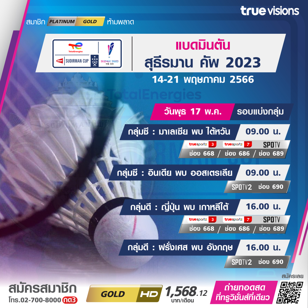 แบดมินตันรายการที่มีประวัติศาสตร์ยาวนาน สุธีรมาน คัพ 2023 การชิงความเป็นหนึ่งของแบดมินตันประเภททีมชิงแชมป์โลก เชียร์ทีมชาติไทยปะทะทีมนานาชาติ ชมสดทุกรอบ ชมสด ทาง ทรูวิชั่นส์ ที่เดียว