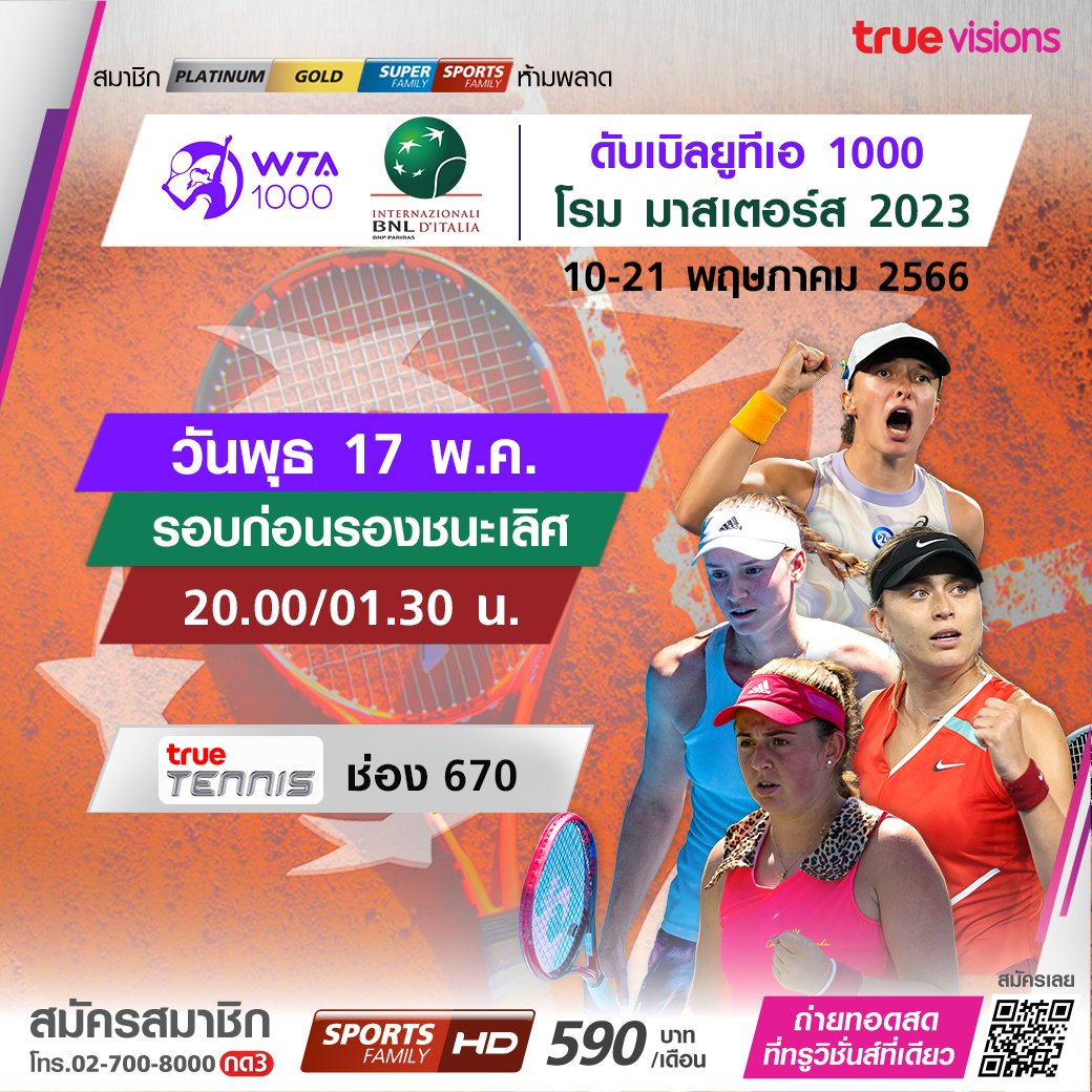 เทนนิสหญิง ดับเบิ้ลยูทีเอ ทัวร์ 1000 ซีรี่ส์ โรม มาสเตอร์ส มาถึงในรอบก่อนรองชนะเลิศ เหล่านักเทนนิสหญิงระดับโลก ใครจะคว้าแชมป์ไปครอง ชมสดครบทุกรอบ ชมสด ทาง ทรูวิชั่นส์ ที่เดียว