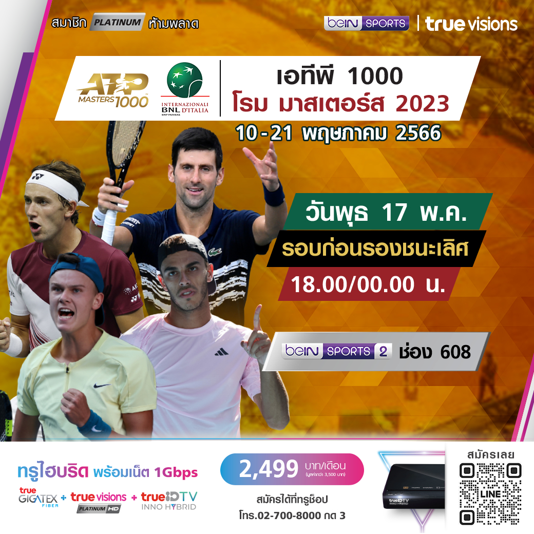 ศึกเทนนิส เอทีพี ทัวร์ 1000 โรม มาสเตอร์ส ที่กรุงโรม ประเทศอิตาลี มาถึงในรอบก่อนรองชนะเลิศ ใครจะคว้าแชมป์ไปครอง ชมสดทุกรอบ ชมสด ทาง ทรูวิชั่นส์ ที่เดียว