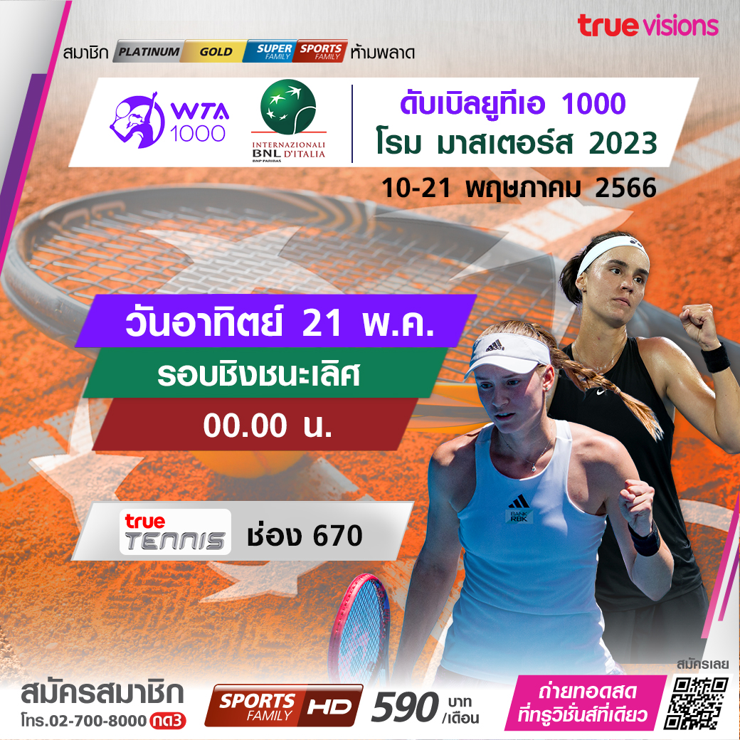 เทนนิสหญิง ดับเบิ้ลยูทีเอ ทัวร์ ระดับ 1000 ซีรี่ส์ รายการ โรม มาสเตอร์ส มาถึงในรอบชิงชนะเลิศ ใครจะคว้าแชมป์รายการนี้ไปครอง ชมสดครบทุกรอบ ชมสด ทาง ทรูวิชั่นส์ ที่เดียว