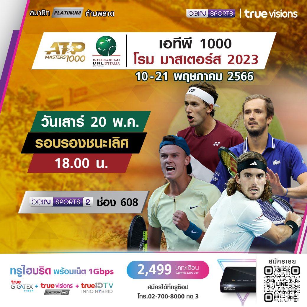 เทนนิส เอทีพี ทัวร์ 1000 ซีรี่ส์ รายการ โรม มาสเตอร์ส ที่เมืองหลวงของอิตาลี รอบรองชนะเลิศ ร่วมเชียร์นักเทนนิส มือดีๆ ของโลก ชมสด ทาง ทรูวิชั่นส์ ที่เดียว