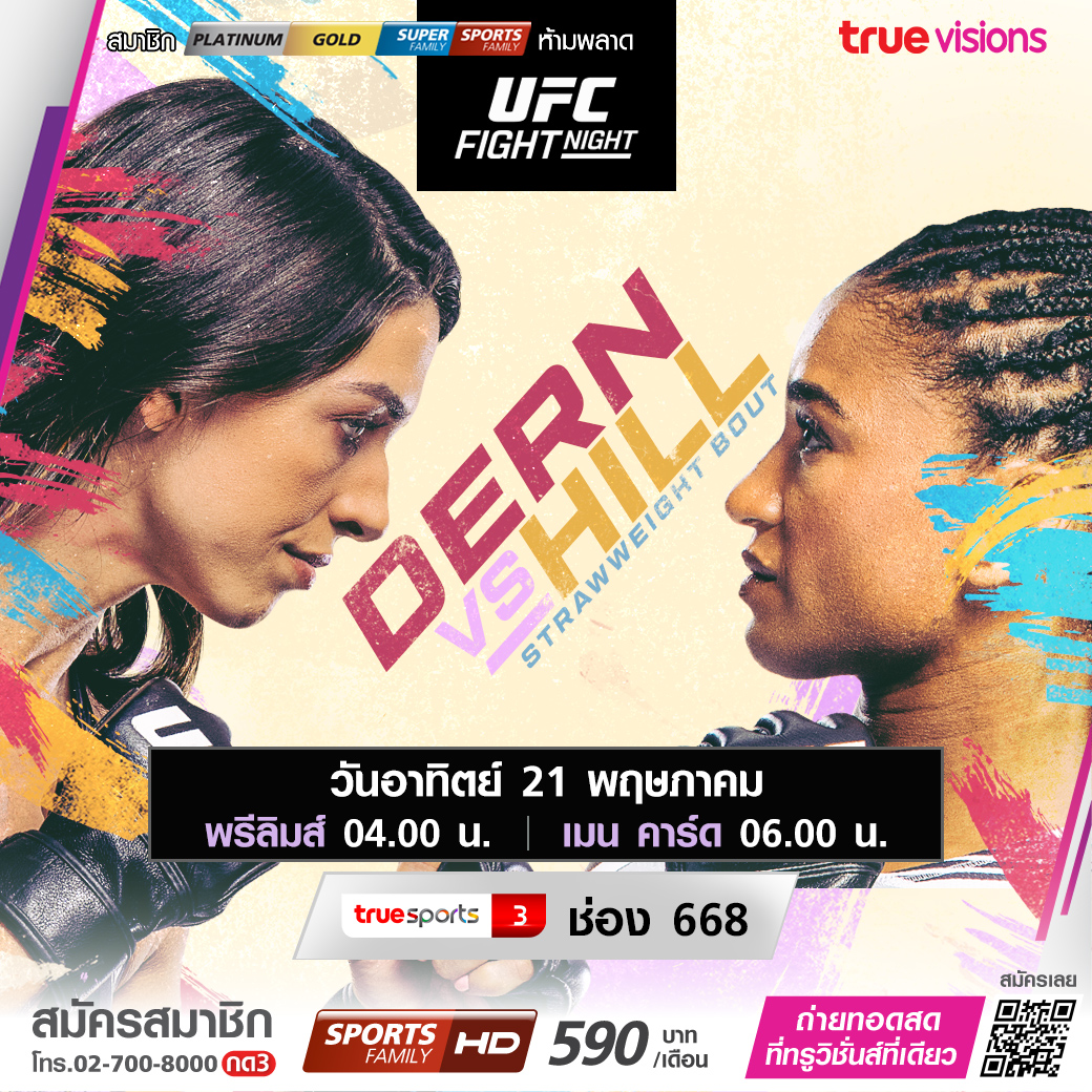 ความมันส์ของการต่อสู้ในกรงเหล็ก 8 เหลี่ยมยังไม่หยุด ยูเอฟซี ไฟต์ ไนท์ สัปดาห์นี้ กลับไประเบิดศึกกันที่ ยูเอฟซี เอเพ็กซ์ ลาสเวกัส คู่เอก เป็นการปะทะกันของ 2 นักสู้สาวชาวอเมริกัน แม็คเคนซี่ เดิร์น กับ แองเจล่า ฮิลล์ ร่วมด้วย เอ็ดเมน ชาบาซยาน ท้าชน แอนโทนี่ เฮอร์นันเดซ ชมสดจุใจ ทั้งช่วงพรีลิมส์ และ เมนคาร์ด แบบเอ็กซ์คลูซีฟ ชมสด ทาง ทรูวิชั่นส์ ที่เดียว