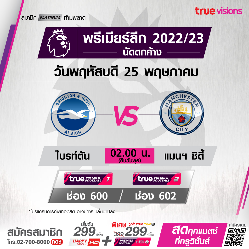 Brighton vs Man City เวลา 02:00 - 04:00 ทางช่อง TPF 1(600) / TPF 2 (602)